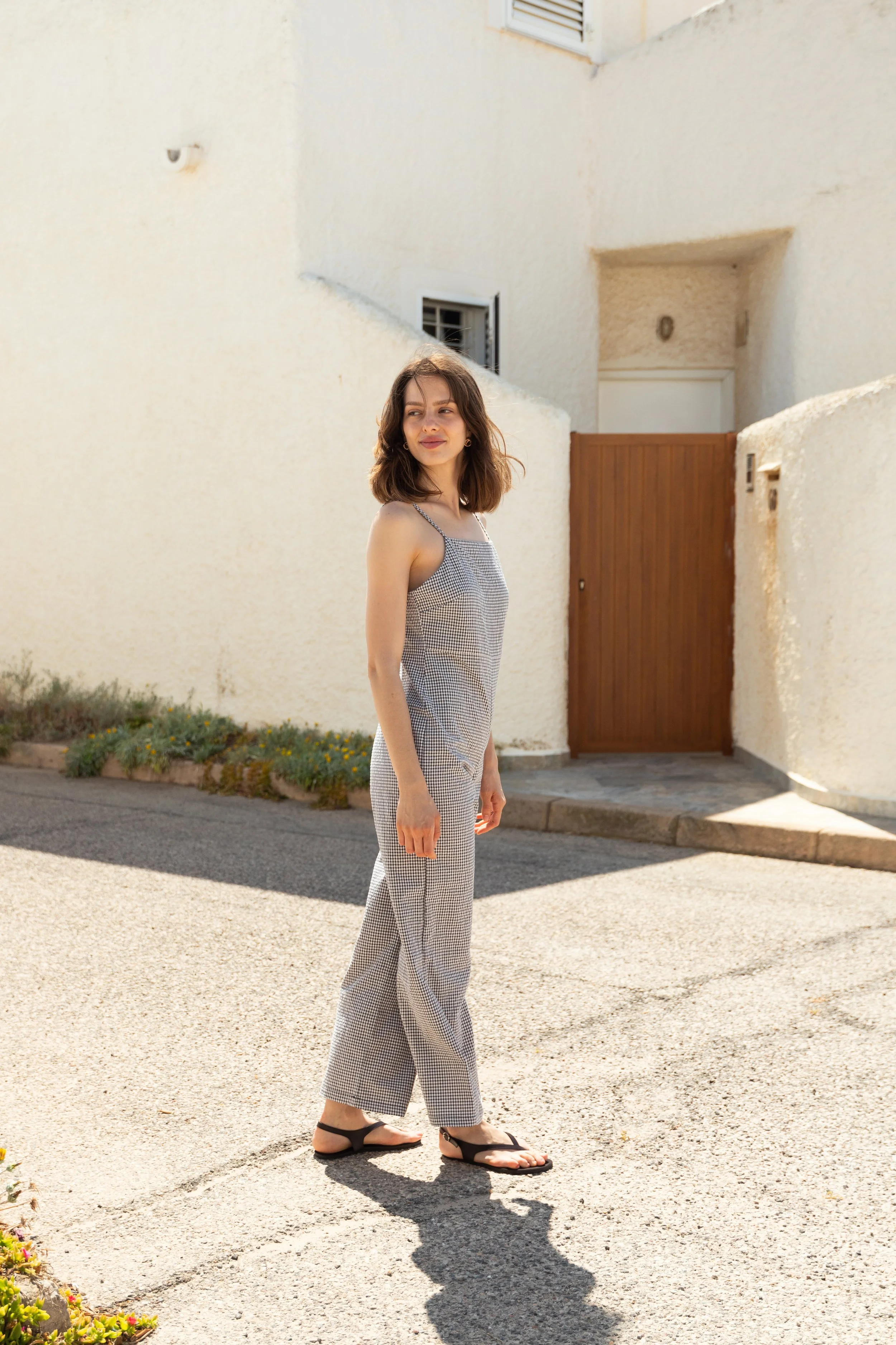 Mujer con pantalón y top de tela gris, de pie en perfil, sonriendo, fondo blanco.
