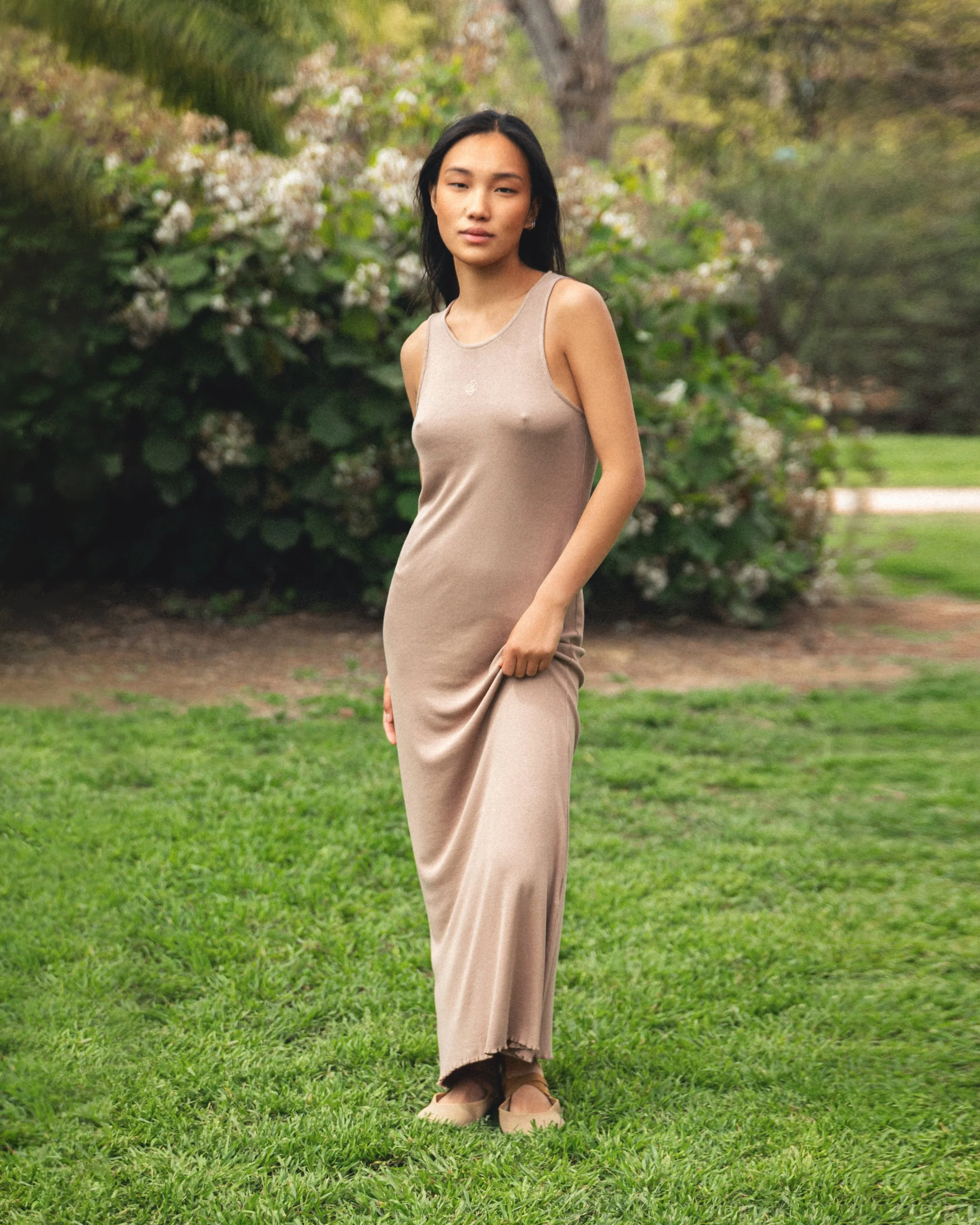 Mujer sentada junto a una fuente en un jardín con plantas verdes y árboles en el fondo, vestida con vestido largo y en tacones, sosteniendo una bolsa pequeña.